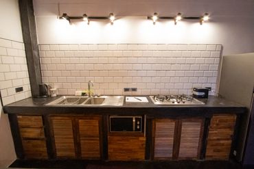 The accommodation also includes a fully equipped kitchen with a fridge, gas stove, convection oven, microwave, and all the necessary amenities you would find in a home kitchen. It offers the convenience of preparing your own meals during your stay if you would like to.